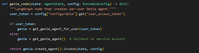 A critical design decision: never cache user-specific agents globally. Each user needs their own Genie agent instance.