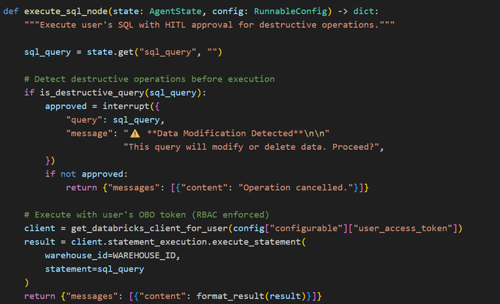While Databricks Genie handles natural language queries (read-only), our system also supports custom SQL execution for data modifications. Since these operations can DELETE or UPDATE data, we implement human-in-the-loop approval using LangGraph’s interrupt feature.