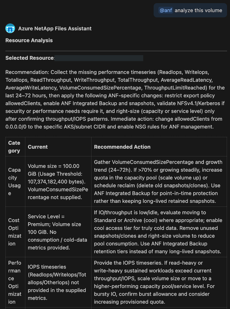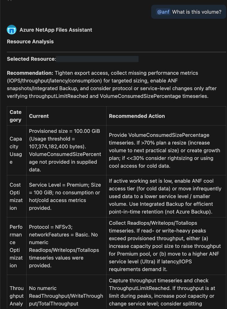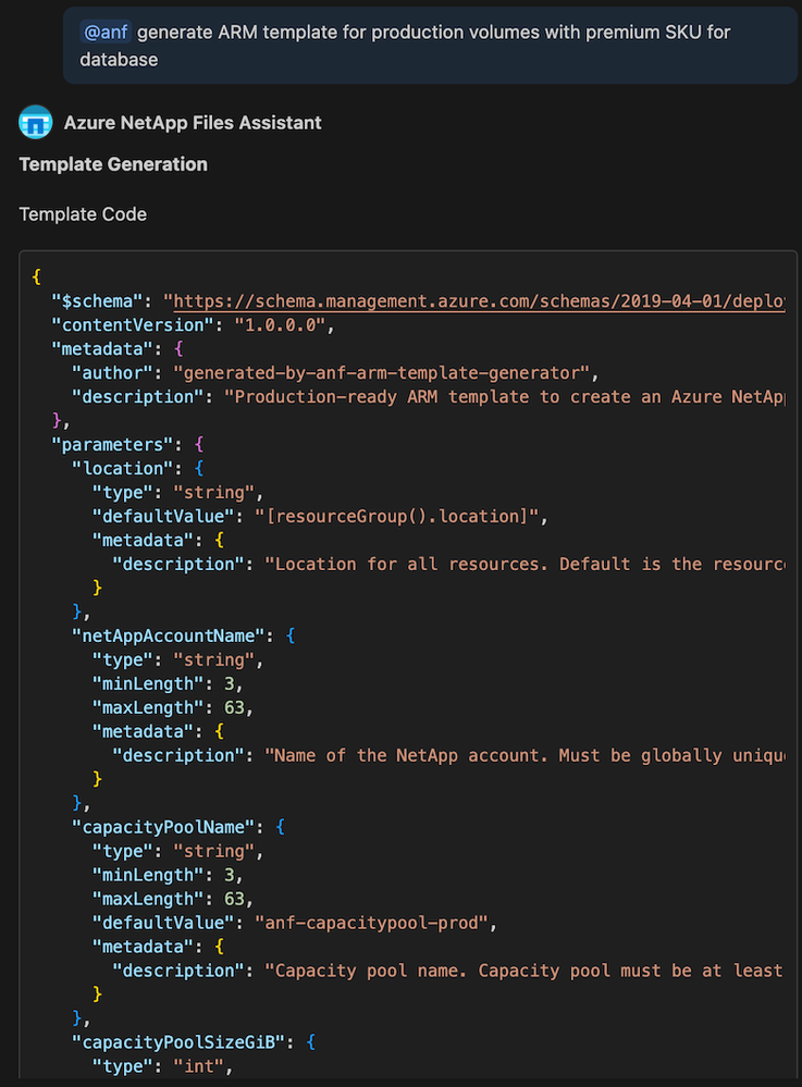 With the Azure NetApp Files VS Code Extension, Aarav stays in his IDE, shifting his workflow from manual clicking to streamlined coding. At the heart of this experience is @anf, an intelligent chat participant that transforms storage management into a seamless conversation. By interpreting natural language commands, @anf empowers developers to instantly generate production-ready ARM templates, inspect critical resource details like capacity and performance tiers, and receive AI-driven optimization recommendations—all without ever leaving the editor. This capability removes the friction of portal navigation, enabling teams to provision, validate, and optimize enterprise-grade storage with the speed and precision of simple text prompts.