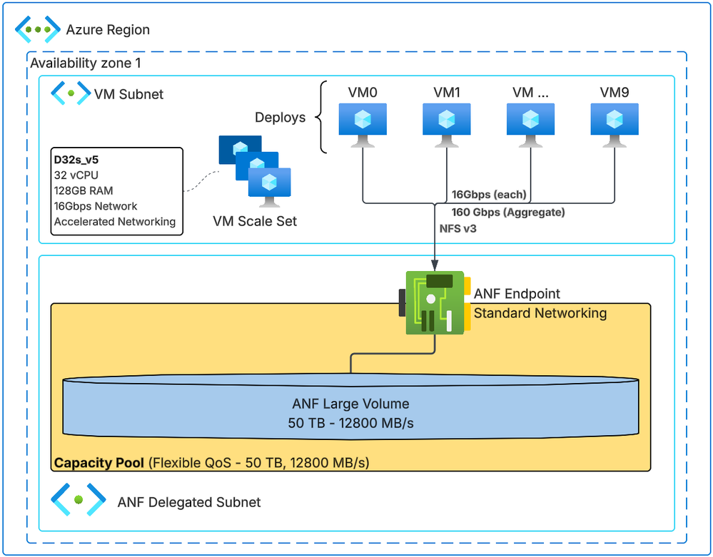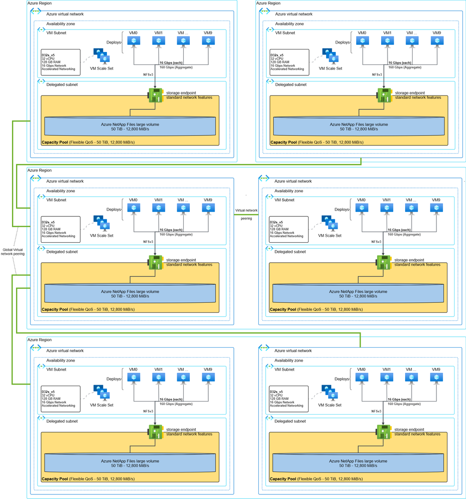 In this scenario, the test deployed six large Azure NetApp Files large volumes, each configured with 50 TiB capacity and a QoS setting of 12,800 MiB/s under the Flexible service level. Each volume was presented through a unique storage endpoint, totaling six IP addresses. For resource availability reasons, the volumes were distributed across multiple Azure regions and availability zones, though this is not a requirement. Deployments can use any number of volumes, and regional distribution is optional – only necessary when targeting specific availability or resilience goals. Sixty client VMs (ten per volume) generated simultaneous load across all six volumes.