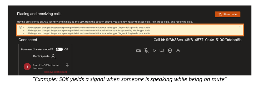 Today we are happy to announce that the Call Diagnostics feature is available in ACS web Calling SDK to help you to build applications with improved management of in-call experience quality. Many factors can influence the call quality: poor network, hardware issues, low volume, OS and permission errors, freezes, etc. You, as a developer, might not know about a specific issue affecting specific call quality or reliability. Microsoft constantly monitors and analyses technical parameters of calls and exposes hints within API. You can use the tips to provide a better experience to your users. For example, you can suggest in UI (or force) to turn off the camera if bandwidth is not enough for both audio and video simultaneously. Or tip the user that they speak while being muted. The SDK does not have access, collect or analyze any personal data.