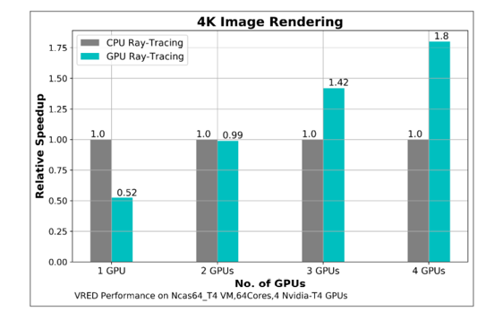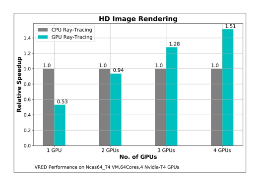 We tested VRED ray tracing using CPU and GPU configurations – and saw a performance improvement of more than 40% when using 3 GPUs, and 80% when using 4 GPUs.
