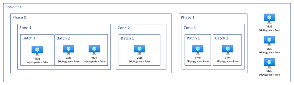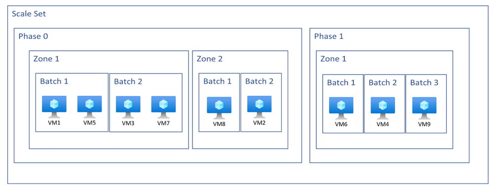 A phase is a grouping construct for virtual machines. Each phase is determined by setting metadata emitted from the application health extension via the customMetrics property. The Virtual Machine Scale Set takes the information retrieved from the custom metrics and uses it to place virtual machines into their assigned phases. Within each phase, the Virtual Machine Scale set will also assign upgrade batches. Each batch is configured using the rolling upgrade policy which takes into consideration the update domains (UD), fault domains (FD), and zone information of each virtual machine.