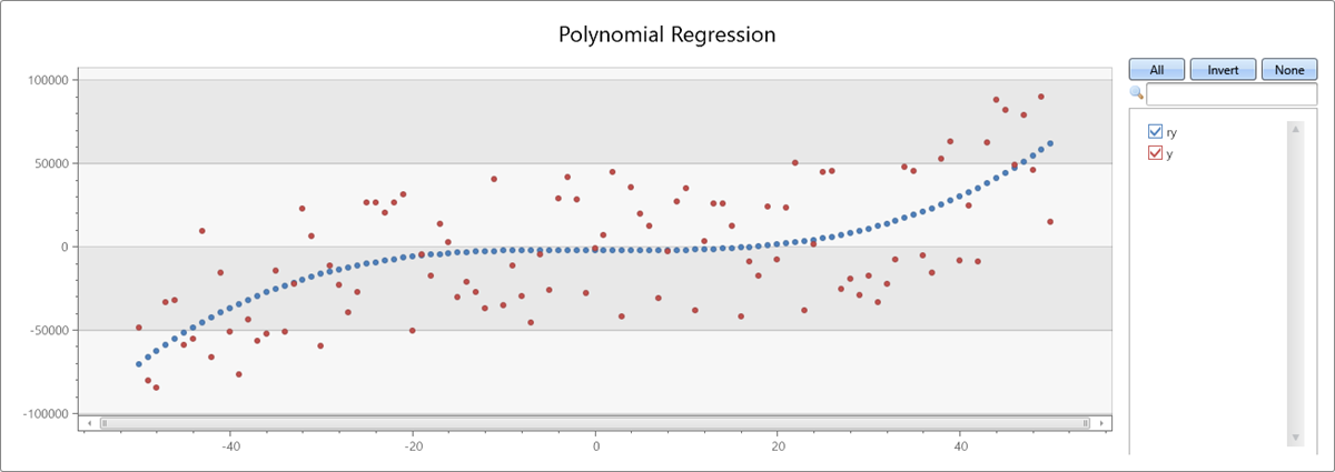| extend y = 0.5*pow(x, 3) + rand(100000) - 50000, ry=0