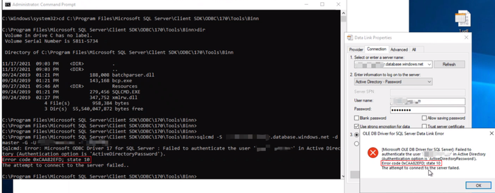 Test with sqlcmd, udl -> Failed to authenticate the user 'xxx' "Error code 0xCAA82EFD; state 10"