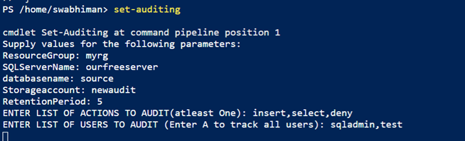 3) Now Execute the function (SET-AUDITING) by using the below Cmdlet in the same PowerShell Session and provide the parameter needed to set auditing along with retention period. (Example below)