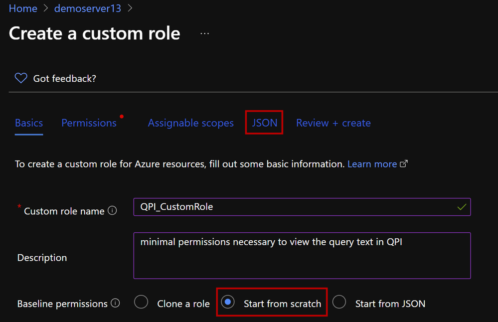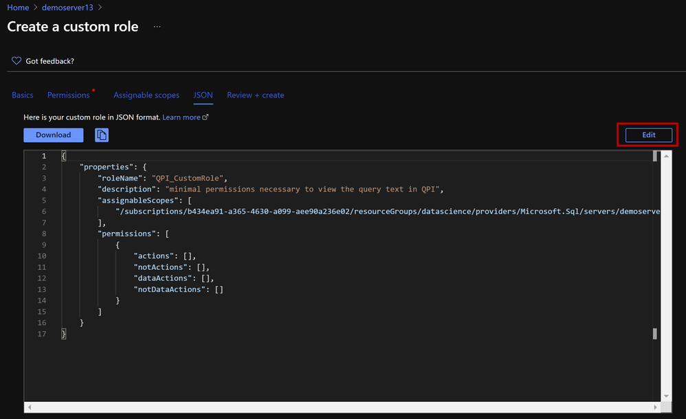5. Add the following permissions and hit Save. You can also download your custom role as JSON file.{ "properties": { "roleName": "QPI_CustomRole", "description": "minimal permissions necessary to view the query text in QPI", "assignableScopes": [ "/subscriptions/<Subscription ID>/resourceGroups/<Resource Group Name>/providers/Microsoft.Sql/servers/<Server Name>" ], "permissions": [ { "actions": [ "Microsoft.Sql/servers/read", "Microsoft.Sql/servers/automaticTuning/read", "Microsoft.Support/*", "Microsoft.Insights/metrics/read", "Microsoft.Insights/metricDefinitions/read", "Microsoft.Sql/locations/databaseOperationResults/read", "Microsoft.Authorization/*/read", "Microsoft.Sql/locations/*/read", "Microsoft.Sql/servers/databases/read", "Microsoft.Sql/servers/databases/providers/Microsoft.Insights/logDefinitions/read", "Microsoft.Sql/servers/databases/queryStore/read", "Microsoft.Sql/servers/databases/queryStore/write", "Microsoft.Sql/servers/databases/queryStore/queryTexts/read", "Microsoft.Sql/servers/databases/topQueries/read", "Microsoft.Sql/servers/databases/topQueries/statistics/read", "Microsoft.Sql/servers/databases/topQueries/queryText/action", "Microsoft.Sql/servers/databases/schemas/tables/columns/read", "Microsoft.Sql/servers/databases/schemas/read", "Microsoft.Sql/servers/databases/schemas/tables/read", "Microsoft.Sql/servers/databases/extensions/read" ], "notActions": [ "Microsoft.Sql/managedInstances/databases/currentSensitivityLabels/*", "Microsoft.Sql/managedInstances/databases/recommendedSensitivityLabels/*", "Microsoft.Sql/managedInstances/databases/schemas/tables/columns/sensitivityLabels/*", "Microsoft.Sql/managedInstances/databases/securityAlertPolicies/*", "Microsoft.Sql/managedInstances/databases/sensitivityLabels/*", "Microsoft.Sql/managedInstances/databases/vulnerabilityAssessments/*", "Microsoft.Sql/managedInstances/securityAlertPolicies/*", "Microsoft.Sql/managedInstances/vulnerabilityAssessments/*", "Microsoft.Sql/servers/databases/auditingSettings/*", "Microsoft.Sql/servers/databases/auditRecords/read", "Microsoft.Sql/servers/databases/currentSensitivityLabels/*", "Microsoft.Sql/servers/databases/dataMaskingPolicies/*", "Microsoft.Sql/servers/databases/extendedAuditingSettings/*", "Microsoft.Sql/servers/databases/recommendedSensitivityLabels/*", "Microsoft.Sql/servers/databases/schemas/tables/columns/sensitivityLabels/*", "Microsoft.Sql/servers/databases/securityAlertPolicies/*", "Microsoft.Sql/servers/databases/securityMetrics/*", "Microsoft.Sql/servers/databases/sensitivityLabels/*", "Microsoft.Sql/servers/databases/vulnerabilityAssessments/*", "Microsoft.Sql/servers/databases/vulnerabilityAssessmentScans/*", "Microsoft.Sql/servers/databases/vulnerabilityAssessmentSettings/*", "Microsoft.Sql/servers/vulnerabilityAssessments/*" ], "dataActions": [], "notDataActions": [] } ] } }