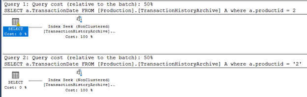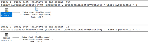 I changed the ProductID from int to varchar to simulate the issue, and on both tables I created the index that covers the ProductID column: