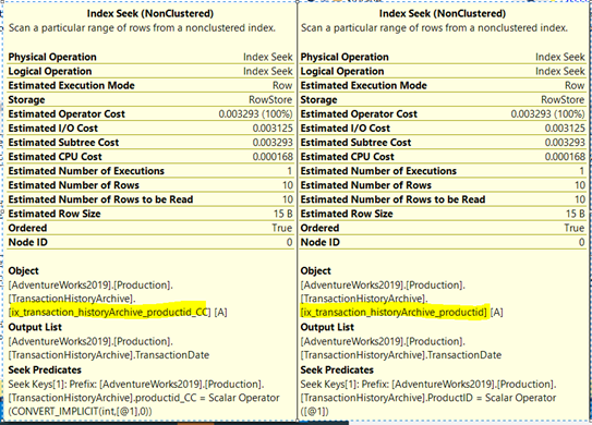 Now the query optimizer is using index seeks; it is smart enough to implicitly use the index created on the computed column even if the computed column ProductID_CC is not explicitly mentioned.