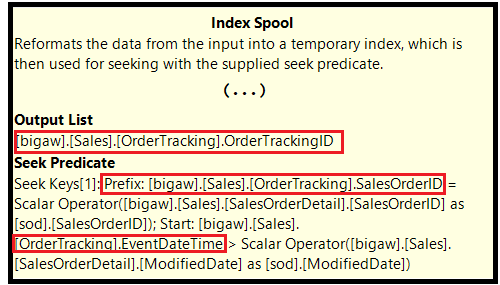 As stated earlier, one interesting pattern regarding Index Spools is that they often cover a missing index to efficiently support the underlying query. If we look further at the Index Spool properties of the same execution plan shown above, we can easily identify the relevant columns for the index we need to create (note that some properties were omitted on the image below):