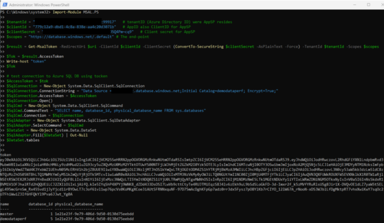 Import-Module MSAL.PS $tenantId = "...99917" # tenantID (Azure Directory ID) were AppSP resides $clientId = "779c12a9-dbd1-4c8a-838e-aa4c20d3071b" # AppID also ClientID for AppSP $clientSecret = "...~cq9" # Client secret for AppSP $scopes = "https://database.windows.net/.default" # The end-point do not modify $result = Get-MsalToken -RedirectUri $uri -ClientId $clientId -ClientSecret (ConvertTo-SecureString $clientSecret -AsPlainText -Force) -TenantId $tenantId -Scopes $scopes $Tok = $result.AccessToken Write-host "token" $Tok # test connection to Azure SQL DB using tocken $AccessToken = $tok $SqlConnection = New-Object System.Data.SqlClient.SqlConnection $SqlConnection.ConnectionString = "Data Source =[servername].database.windows.net;Initial Catalog=demodataperf; Encrypt=True;" $SqlConnection.AccessToken = $AccessToken $SqlConnection.Open() $SqlCmd = New-Object System.Data.SqlClient.SqlCommand $SqlCmd.CommandText = "SELECT name, database_id, physical_database_name FROM sys.databases" $SqlCmd.Connection = $SqlConnection $SqlAdapter = New-Object System.Data.SqlClient.SqlDataAdapter $SqlAdapter.SelectCommand = $SqlCmd $DataSet = New-Object System.Data.DataSet $SqlAdapter.Fill($DataSet) | Out-Null $DataSet.tables