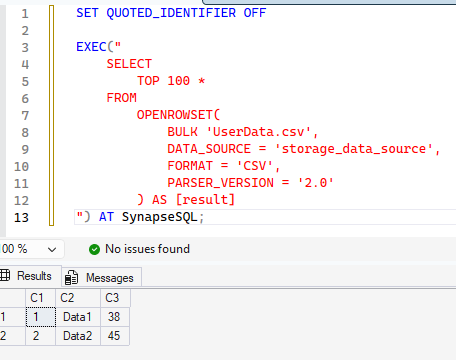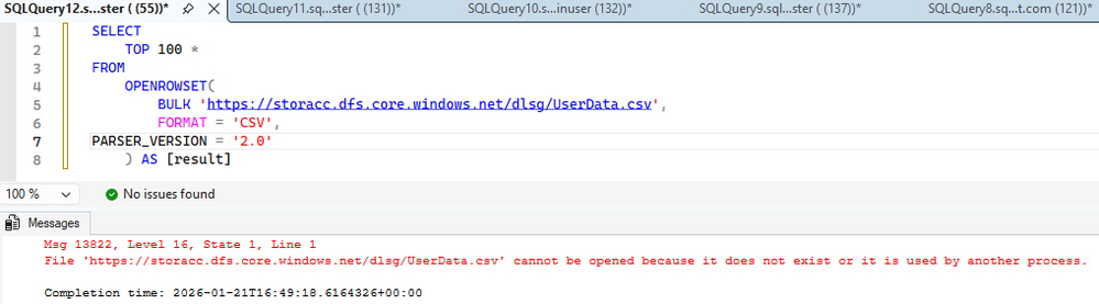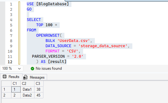 In both cases, the login cannot authenticate to the storage account. For it to work with SQL Authentication, we will need to set up a database scoped credential, and an external data source on a user database (Solution 1). For Entra ID, you can follow the same steps or simply apply RBAC permissions to the storage account for the credential used (Solution 2).