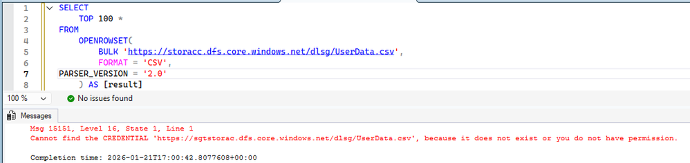 WITH (LOCATION = 'abfss://dlsg@storacc.dfs.core.windows.net', CREDENTIAL = [storage_access])