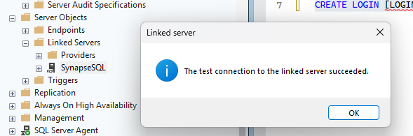 Now that we can query in Synapse, we can set up the linked server in SQL Managed Instance, however, we need to make sure the login being used exists in Synapse SQL.