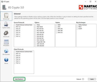 Option #2 - Alternatively, you can download IIS Crypto Tool from here and configure the best practices on your client and server.