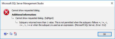 For help, click: https://docs.microsoft.com/sql/relational-databases/errors-events/mssqlserver-512-database-engine-error