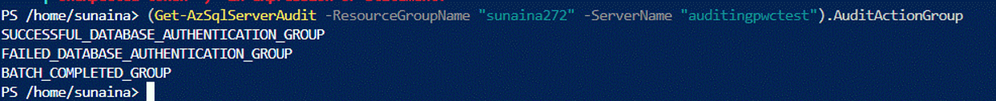 (Get-AzSqlServerAudit -ResourceGroupName "<RG>" -ServerName "<ServerName>").AuditActionGroup