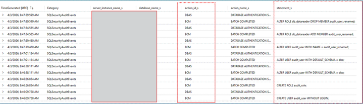 As a result, SQL batches — including DDL statements like CREATE, ALTER, or DROP on database objects — are captured under the BATCH_COMPLETED_GROUP and appear with action_id = BCM