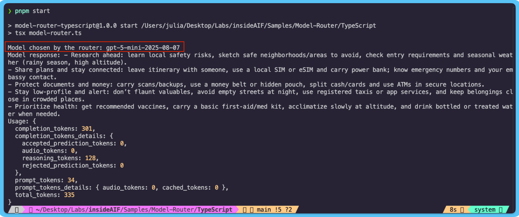 - From the response, we extract the `model` field to see which underlying model was selected by the router, along with the generated content and usage statistics.