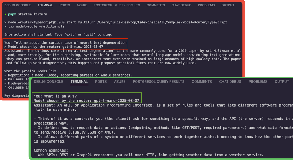 Output in terminal after running an API call through the model-router. Model chosen by the router: gpt-5-mini-2025-08-07In a multi-turn conversation, you would observe the router potentially selecting different underlying models for each turn based on the evolving context and complexity of the conversation.