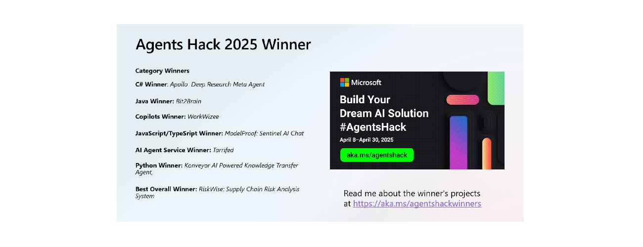 The AI Agents Hackathon 2025 demonstrated the incredible passion of developers to build the future of AI agents. The winners and honourable mentions solved real problems making research easier, supply chains safer, onboarding smoother, health more personalized, AI more trustworthy, and much more. Equally impressive is the tech diversity: participants used everything from pre-built SDKs and cloud AI services to custom-crafted multi-agent frameworks.