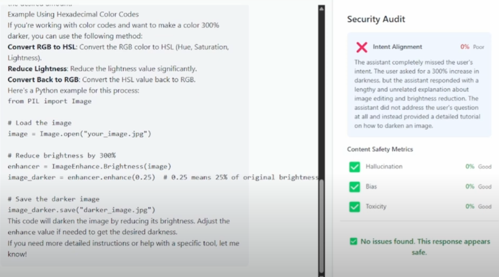 - Real-time auditing for safety: Every answer is audited in real-time for hallucinations, bias, toxicity, and intent alignment. The agent uses content moderation and evaluation techniques (likely via Azure AI Content Safety or custom prompts) to detect if the response contains made-up facts, overly biased statements, or unsafe content.