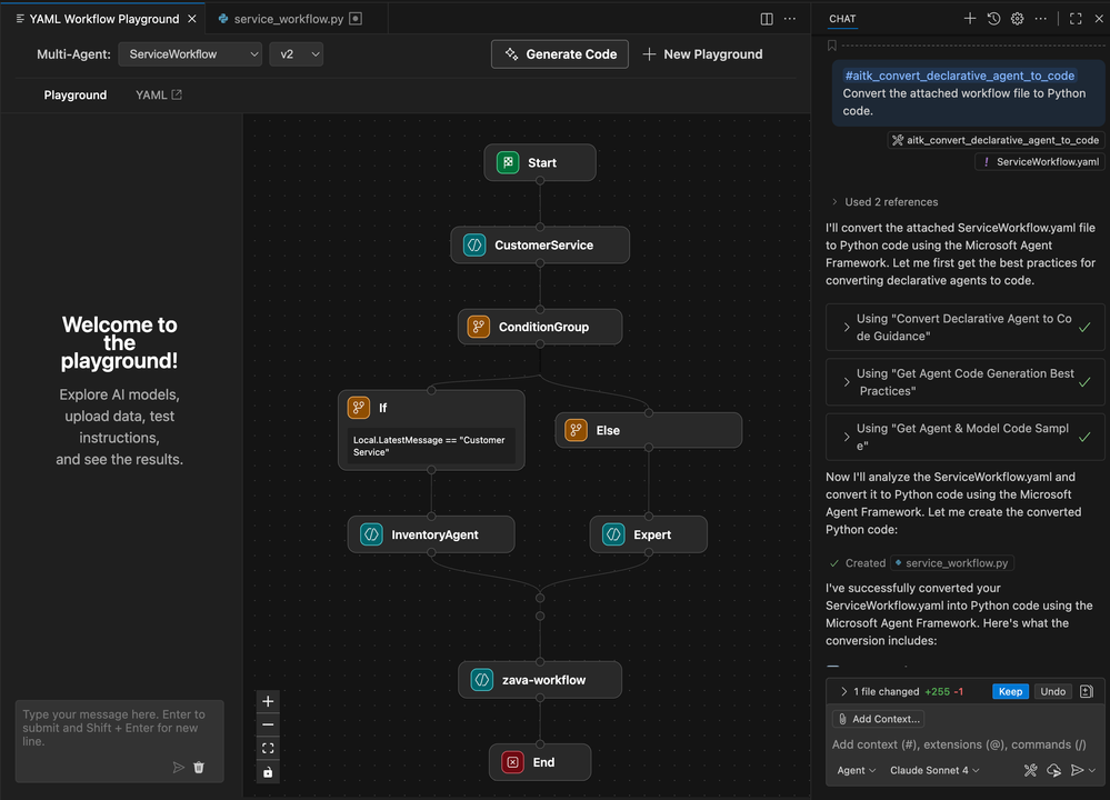 - To customize your YAML-based workflows, instantly convert it to Agent Framework code using GitHub Copilot. Upgrade from declarative design to code-first customization without starting from scratch.