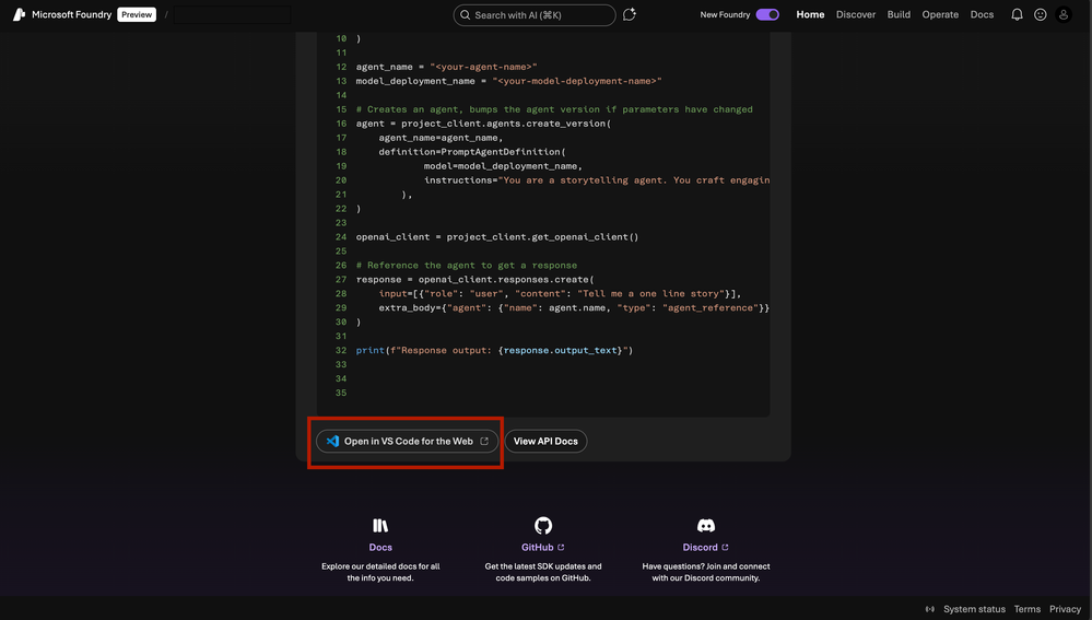 - Jump from Foundry Portal to VS Code Web for a development environment in your preferred code editor setting.