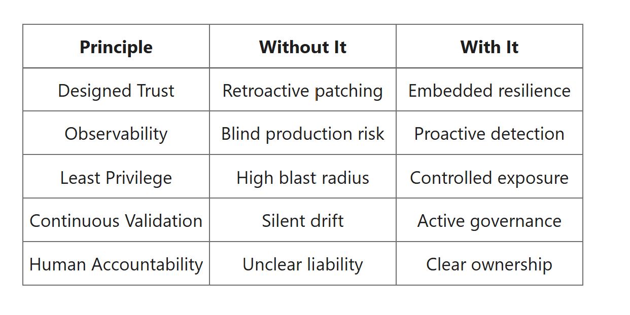 Trust Is Designed, Not Bolted On- Trust cannot be added after deployment. By the time an agent reaches production, its data flows, permissions, reasoning boundaries, and safety posture must already be structurally embedded. Trust is architecture, not configuration. Architecturally this means trust must exist across all layers:
