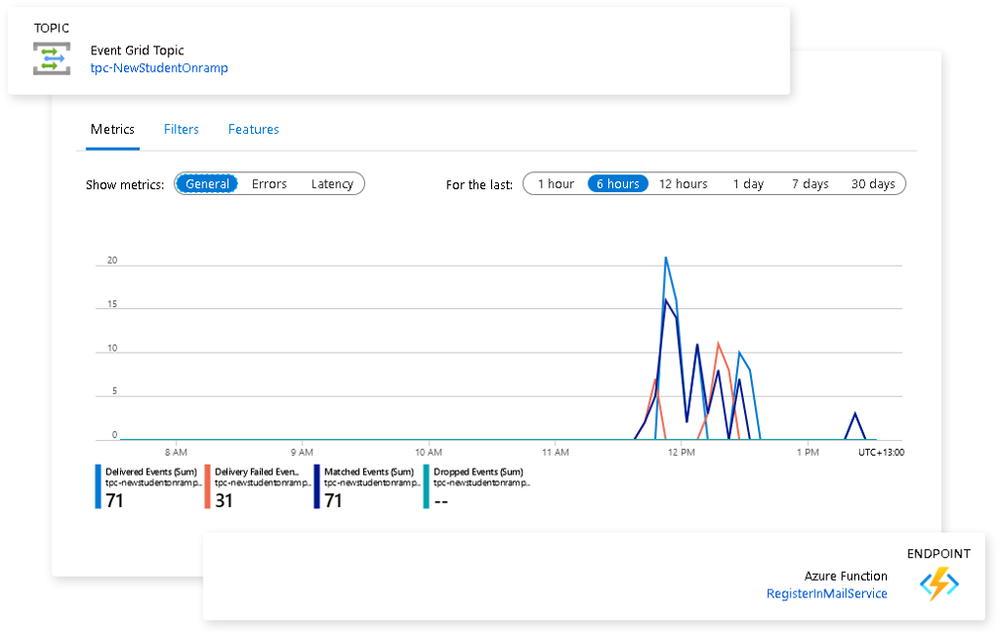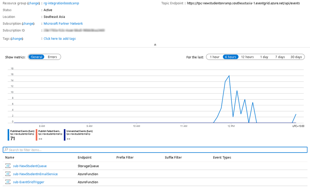 The following illustrates an example of a custom topic. This shows all 71 events have successfully been published to at least one subscription.
