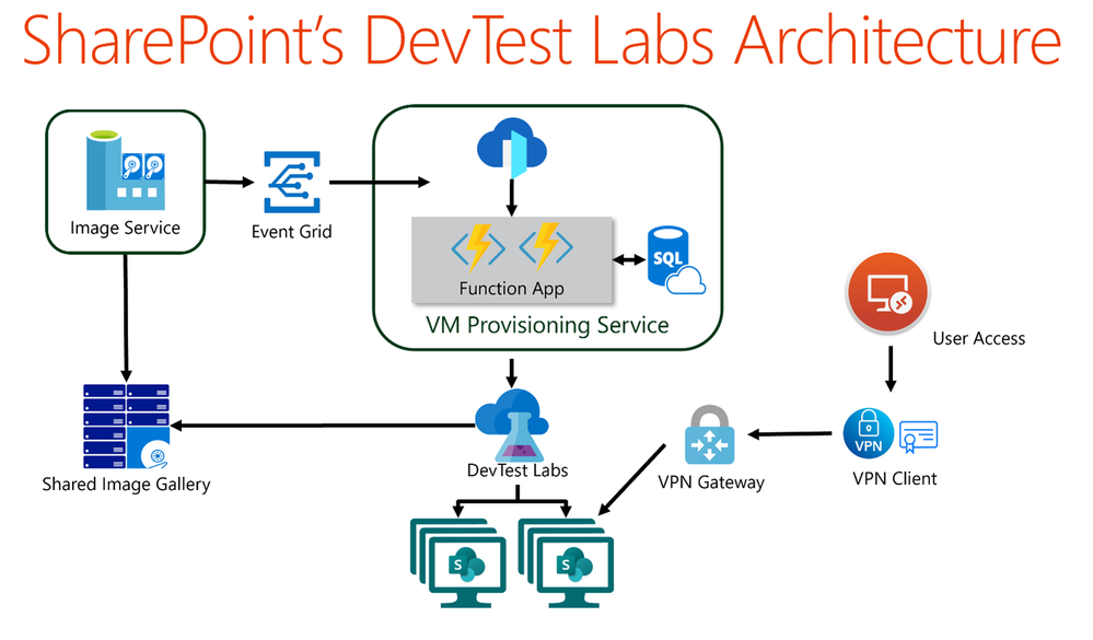 Below is a diagram covering the architecture. Starting from the left, we have an Image Service which is responsible for creating Azure Compute images with SPO pre-configured. Image Service pulls the latest build available, triggers the deployment, waits for success, and publishes the result to Azure Shared Image Gallery for general consumption by DevTest Labs. It then fires an event that, by way of Event Grid, triggers an Azure Function App.