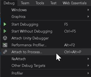 Within Visual Studio, select the Attach to Process action in the Debug window: