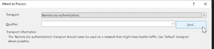 In the Transport, Remote is used and the Find button is used to establish the remote connection: