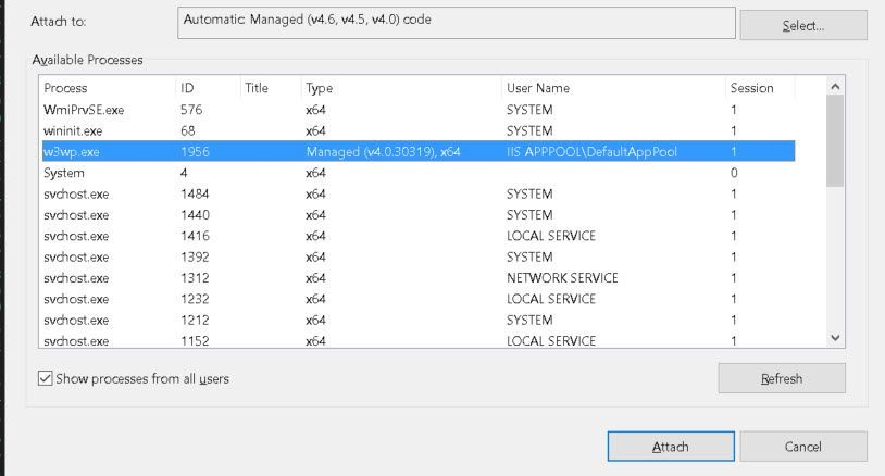 Once the container has been selected, then the running process can be selected. For example, if debugging a IIS web application: