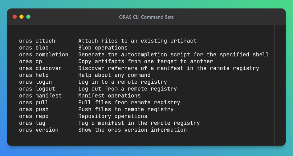 ORAS is a client tool for working with OCI artifacts and registries. It allows you to distribute OCI artifacts across OCI registries and file system. ORAS works similarly to tools you may already be familiar with, such as Docker. What ORAS does differently is shift the focus from container images to other types of artifacts.