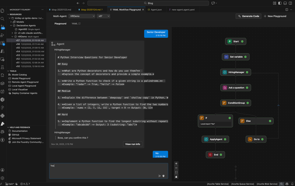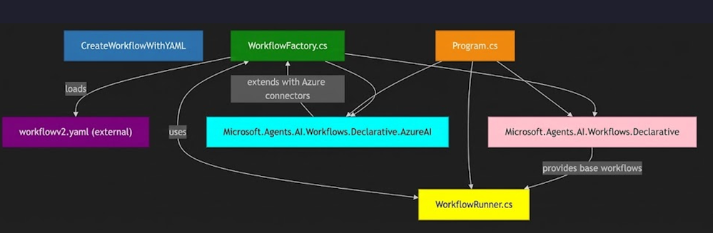 This is where the Microsoft Agent Framework shines as a runtime engine. It natively ingests the declarative Workflow definitions (YAML) exported from Foundry. This allows artifacts from the prototyping phase to be directly promoted to application deployment.