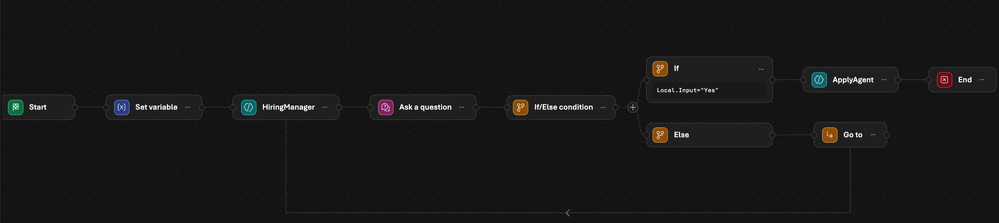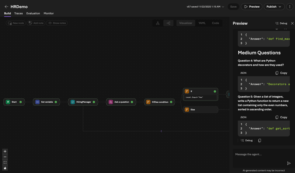 - Orchestrating the Interaction: We drag these nodes onto the board and define the data flow. The process begins with the Recruiter generating questions, piping that output directly as input for the Applicant agent.