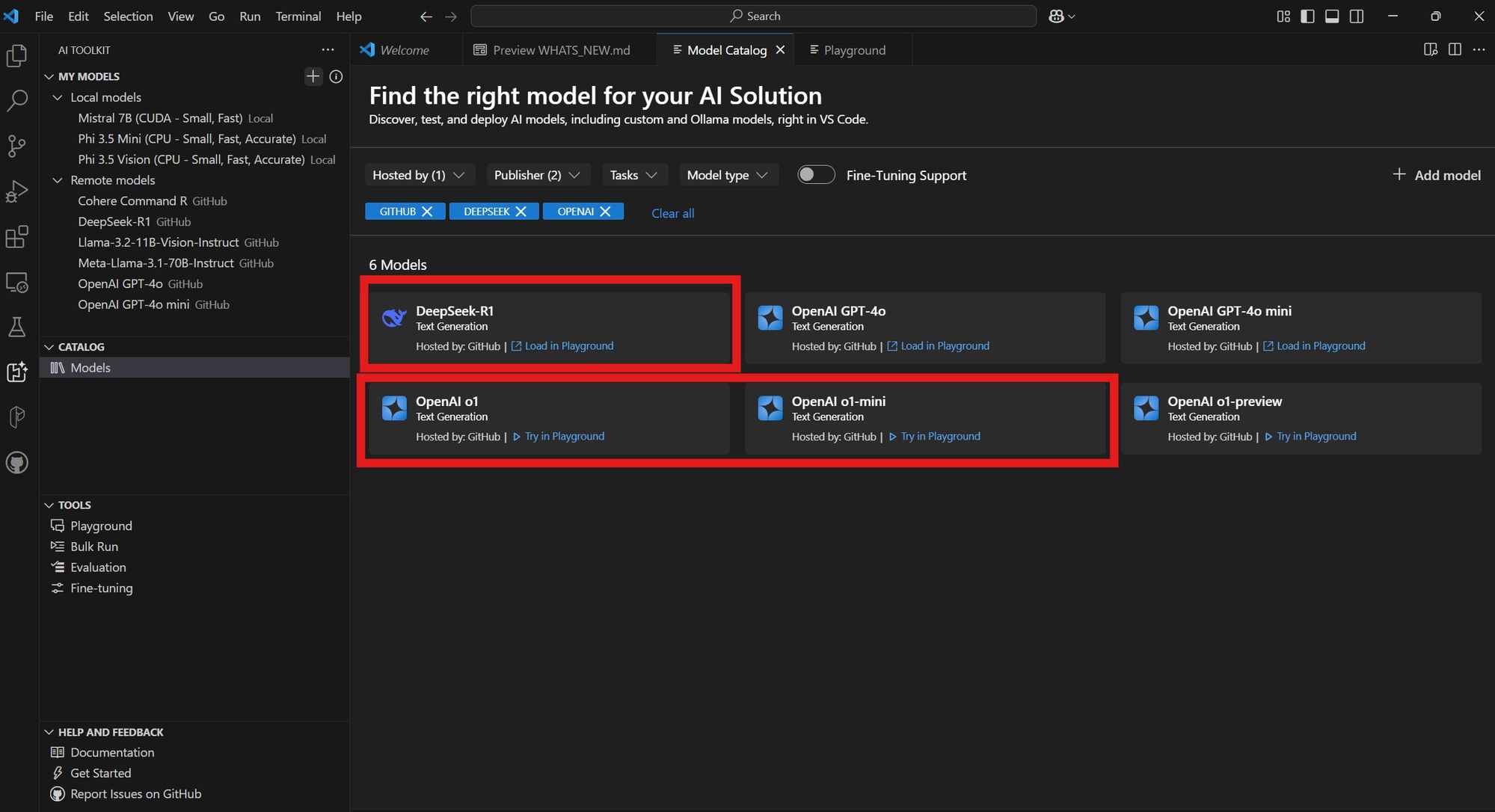 Reasoning models like OpenAI’s o1, o1-mini, o3-mini, and DeepSeek-R1 are available in the AI Toolkit for VS Code model catalog, Azure AI Foundry model catalog as well as online for free usage (rate-limited) in the Github Marketplace for models.