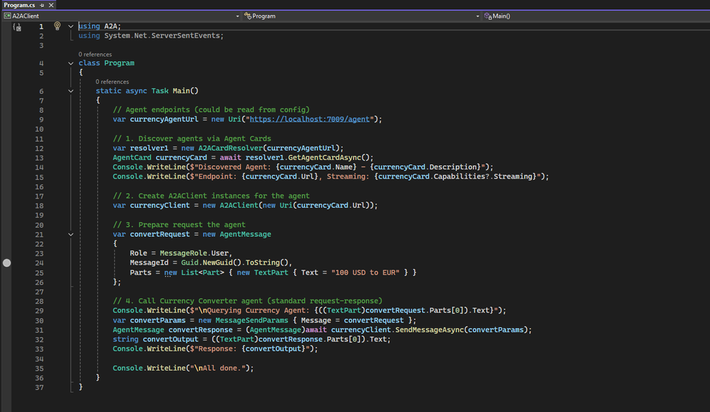 Below is a minimal Currency Agent implemented in ASP.NET Core. It responds by converting amounts between currencies.