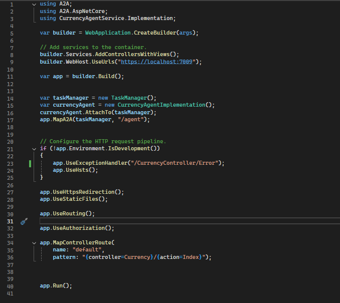 In the Program.cs of the Currency Agent Solution, create a TaskManager , and attach the agent to it, and expose the A2A endpoint.