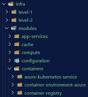 For now we just have infra in our repo (code to be added later) so we put the Bicep in a folder called /infra with sub-folders for modules and the levels.