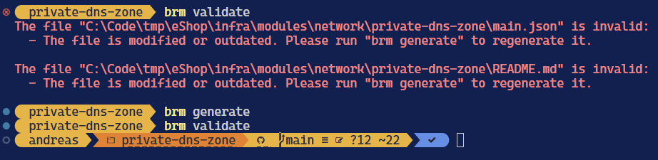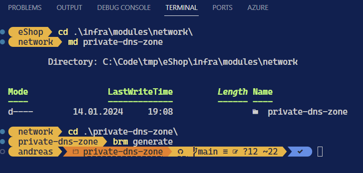 The docs tells us that the Private DNS Zone is part of the Network provider so while in the /infra/modules/network folder we create a sub-folder and let brm scaffold the files for us: