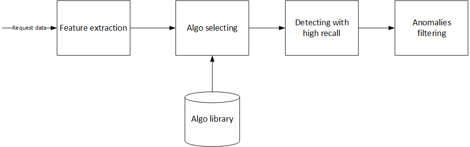 When we get the time series from an API request, the first thing is to extract features from the time series, for example continuity, mean, STD, trend, and period. With those features, the system selects the most appropriate algorithm.