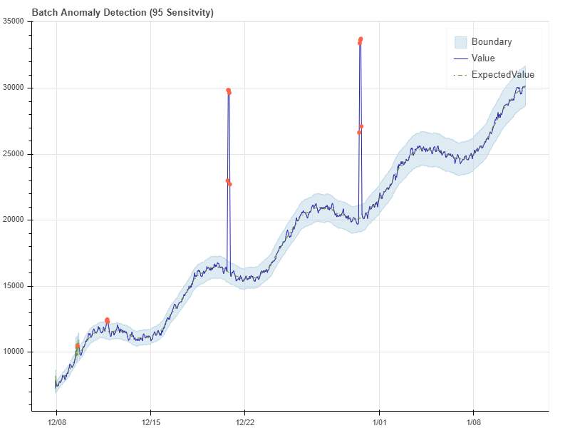 This notebook shows you how to send a batch anomaly detection request, and visualize the anomalies found throughout the example data set. The graph created at the end of this notebook will display the following items: