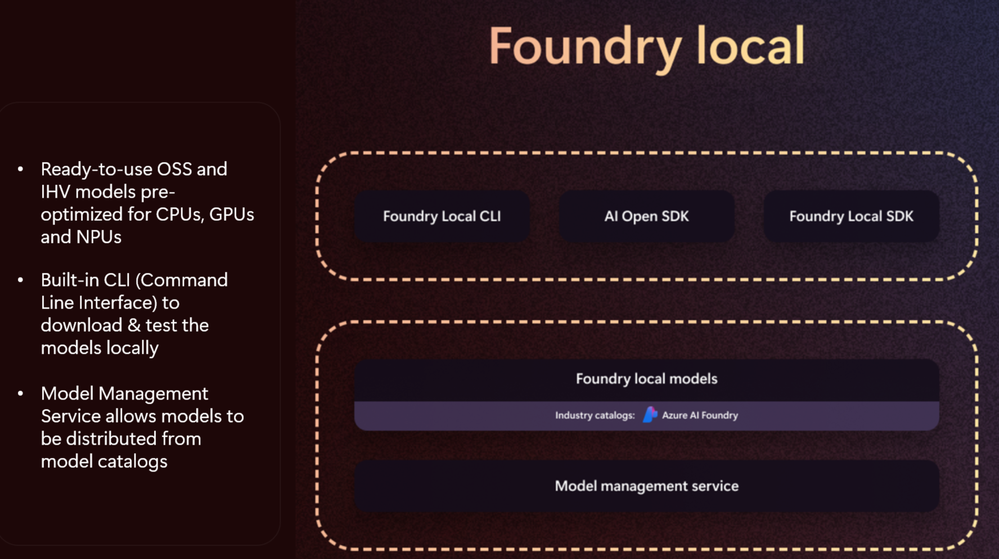 Foundry Local is a set of development tools designed to help you build and evaluate LLM applications on your local machine. It provides a curated collection of production-quality tools, including evaluation and prompt engineering capabilities, that are fully compatible with Azure AI. This allows for a seamless transition of your work from your local environment to the cloud. Don't miss this opportunity to connect with our experts and enhance your understanding of local LLM development.