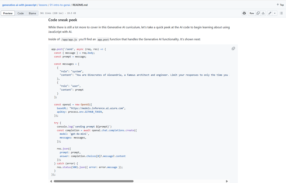 In the first lesson, for example, students learn about the fundamentals of Generative AI and LLMs, exploring their applications and limitations in a JavaScript development context. In addition to the text content, there’s an intro video and supporting slides, offering multiple ways to learn.