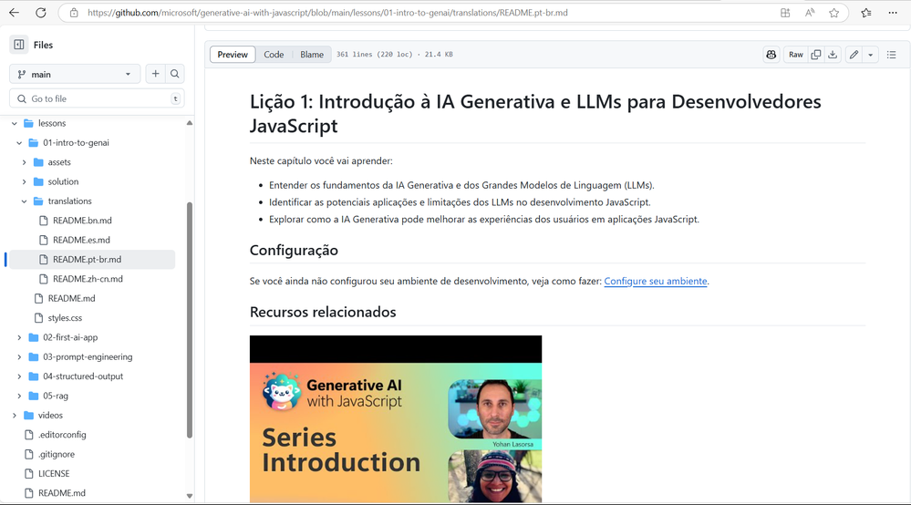 During the video, I gave a full tour of the repository, highlighting that the course was originally in English (now it’s available in Portuguese too!!).