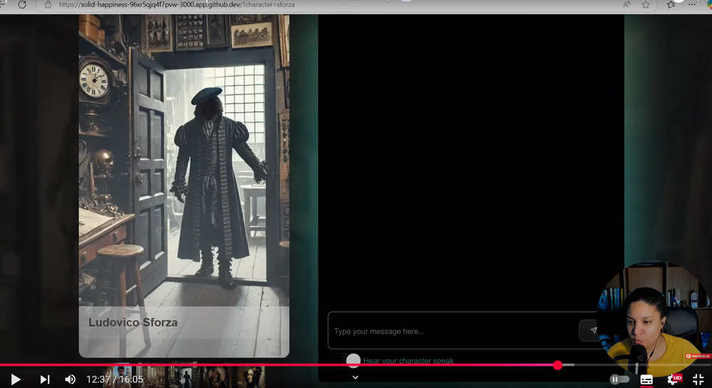 One of the course highlights is the Characters App, an interactive application that simulates conversations with historical figures using LLMs. The video shows how to run this app directly in Codespaces—just navigate to the correct folder, run npm install and npm run start, and open port 3000 in the integrated browser.