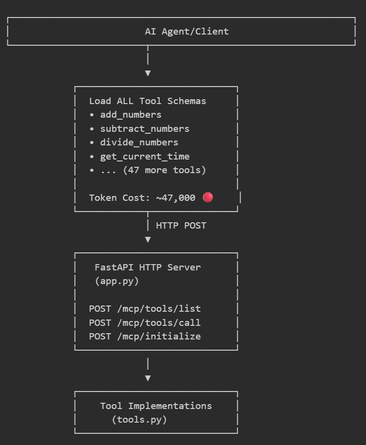 AI Agent Says: "Load all tool definitions from all servers" ↓ Context Window Bloat ❌ ↓ Limited space for reasoning