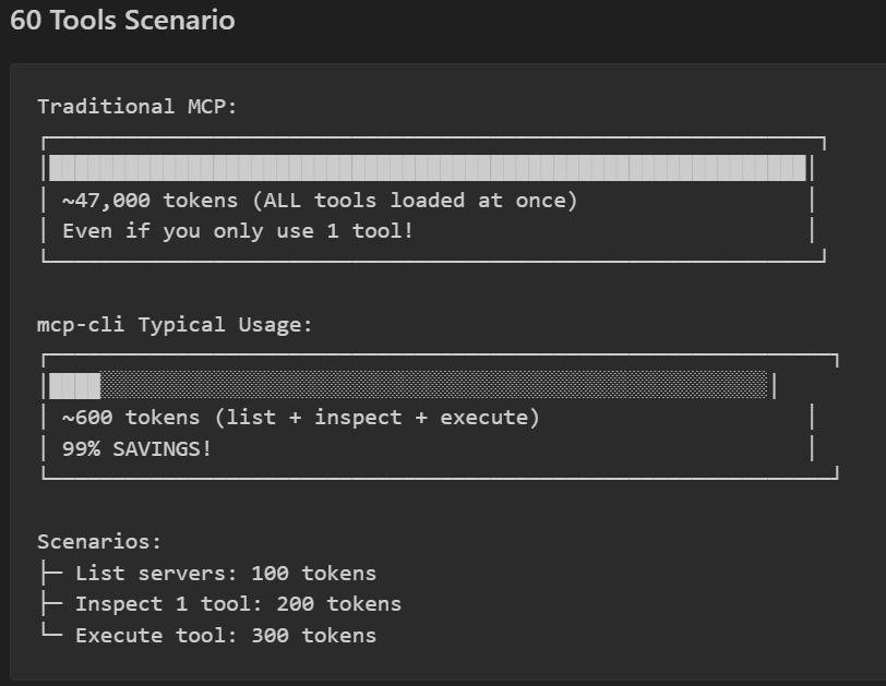| Token Usage | High (~47k for 60 tools) | Low (~400 for 60 tools) |